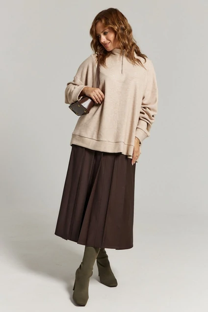 Юбка в темно-коричневом цвете из костюмно-плательной ткани, которая красиво драпируется, создавая аккуратный силуэт. Юбка имеет высокую талию и застежку на молнию по спинке изделия. По одному боку изделия разрез для удобства и стиля всей юбки. Длина миди. Модель будет отлично сочетаться как с обувью на плоской подошве, так и с туфлями на каблуке, делая её универсальным элементом гардероба.