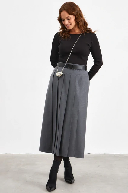 Юбка в сером цвете из костюмно-плательной ткани, которая красиво драпируется, создавая аккуратный силуэт. Юбка имеет высокую талию и застежку на молнию по спинке изделия. По одному боку изделия разрез для удобства и стиля всей юбки. Длина миди. Модель будет отлично сочетаться как с обувью на плоской подошве, так и с туфлями на каблуке, делая её универсальным элементом гардероба.