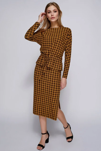 - Юбка-миди из трикотажного полотна с рисунком гусиная лапка; на обтачке; с застёжкой на потайную молнию в левом боковом шве; боковые швы заканчиваются разрезами