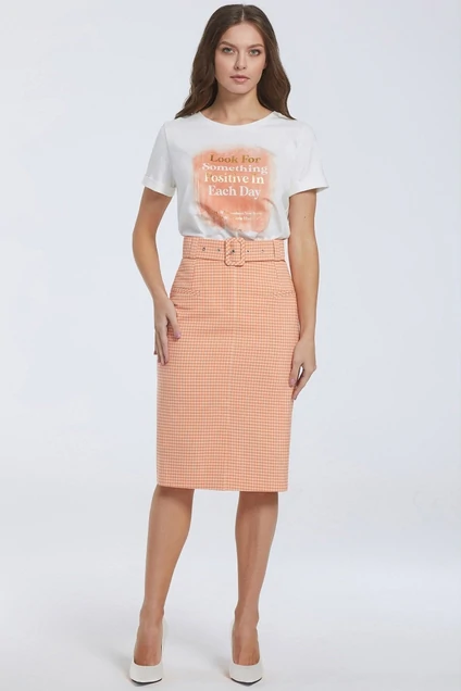 Классическая юбка карандаш – базовая модель гардероба. Её легко вписать как в стилистику спорт-шика, так и в офисный дресс-код. Модель с завышенной талией, на притачном поясе со шлёвками. Перед с горизонтальными карманами-обманками с рамками, застёжкой на молнию и петлю-пуговицу в среднем шве и шлицей. Изделие выполнено из испанской мягкой, приятной на ощупь ткани с добавлением вискозы, с дизайном яркая мелкая клетка мандаринового трендового цвета. Завершает модель тканевый пояс с обтяжной пряжкой в тон.