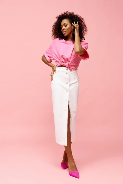Юбка женская выполнена из хлопкового полотна. Юбка прилегающего силуэта. Пояс стабильный по поясу нашиты шлевки. Застежка центральная - петли пуговички. По заднему полотну два крупных кармана. Длина изделия 80 см.