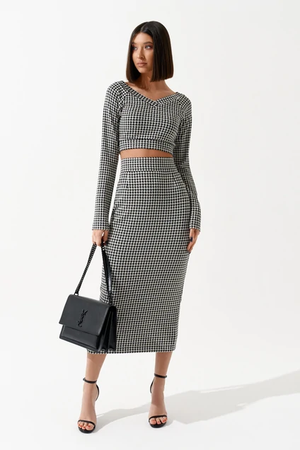 Характеристики: Юбка прилегающий силуэт, подкладка, пояс стабильный, застёжка - потайная тесьма молния в среднем шве заднего полотна, по заднему полотну в среднем шве разрез 34 см. Длина юбки: 83 см.