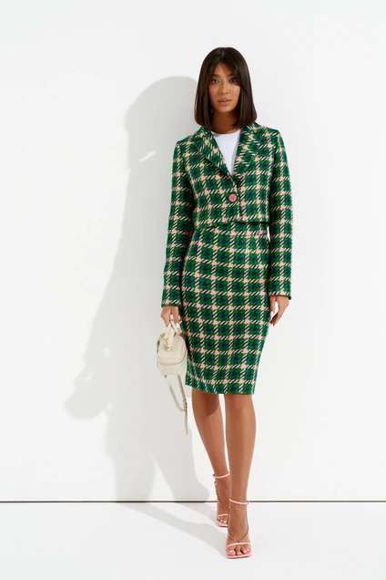 Юбка прилегающего силуэта выполнена из фактурной ткани. Классический прилегающий силуэт позволит создать Вам свой индивидуальный образ, нити разных насыщенных цветов сделают образ ярким.