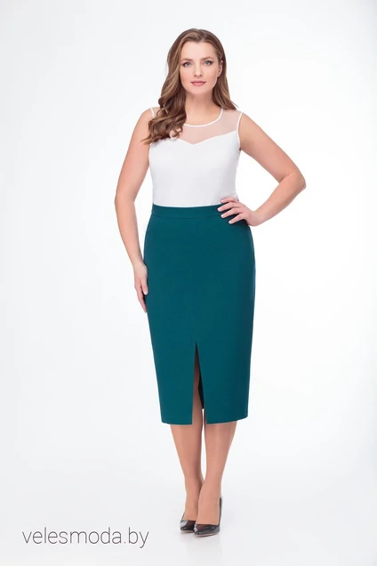 Юбка женская прилегающего силуэта, с притачным поясом, который застёгивается на петлю пуговицу, по переднему полотнищу с талиевыми вытачками, с рельефным швом, переходящим в разрез, по заднему полотнищу со средним швом, с застежкой на потайную тесьму-молнию, с талиевыми вытачками, разрезом внизу. Юбка длиной ниже линии коленей, с притачной подкладкой.