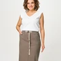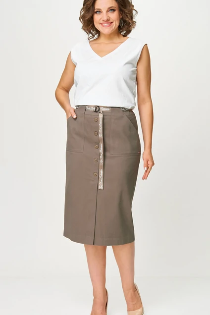 Юбка женская из хлопковой ткани. На подкладке, прямого силуэта, заужена к низу. Притачной пояс-кокетка, настрочены по переду накладные карманы и обработана по центру планка, которая заканчивается шлицей. Спинка со средним швом и талиевыми вытачками. В среднем шве застежка на потайную тесьму-молнию. К юбке прилагается пояс. Длина юбки по боковому шву 68 см.