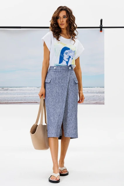Юбка полуприлегающего силуэта на запах, на притачном поясе и застежкой на 2 петли-пуговицы. По перду имитация карманов с клапаном. На задней части вытачки.
