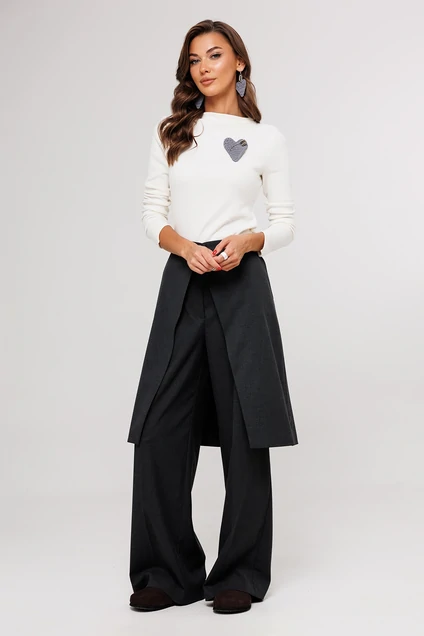 Юбка А-силуэта на притачном поясе. Перед с карманами в боковых швах с наклонным входом и центральной застежкой на петлю-пуговицу, где края борта от застёжки к низу расходится. Спинка с вертикальными вытачками от пояса. Юбка на подкладке.