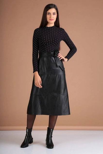 Юбка выполнена из экокожи высокого качества, изнанка в ткани - замш. Ткань тянется.