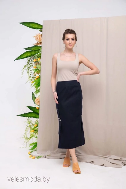 Юбка из льняной ткани прямого силуэта на притачном поясе. По переду рельефы, идущие от пояса до низа изделия и декоративные деталями в виде пояса с блочками и пряжкой. Заднее полотнище со средним швом. Разрезы в боковых швах.