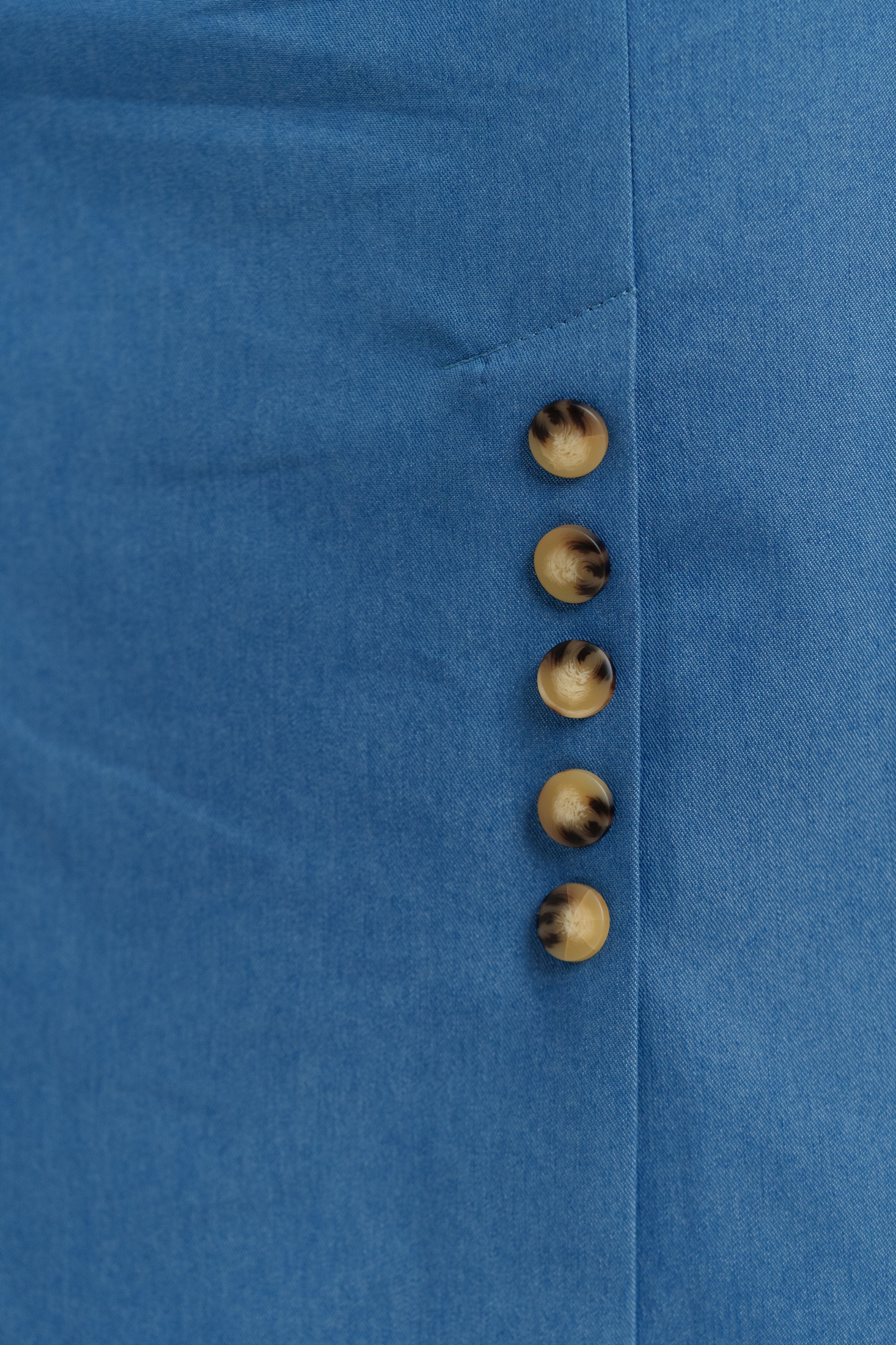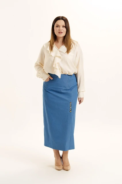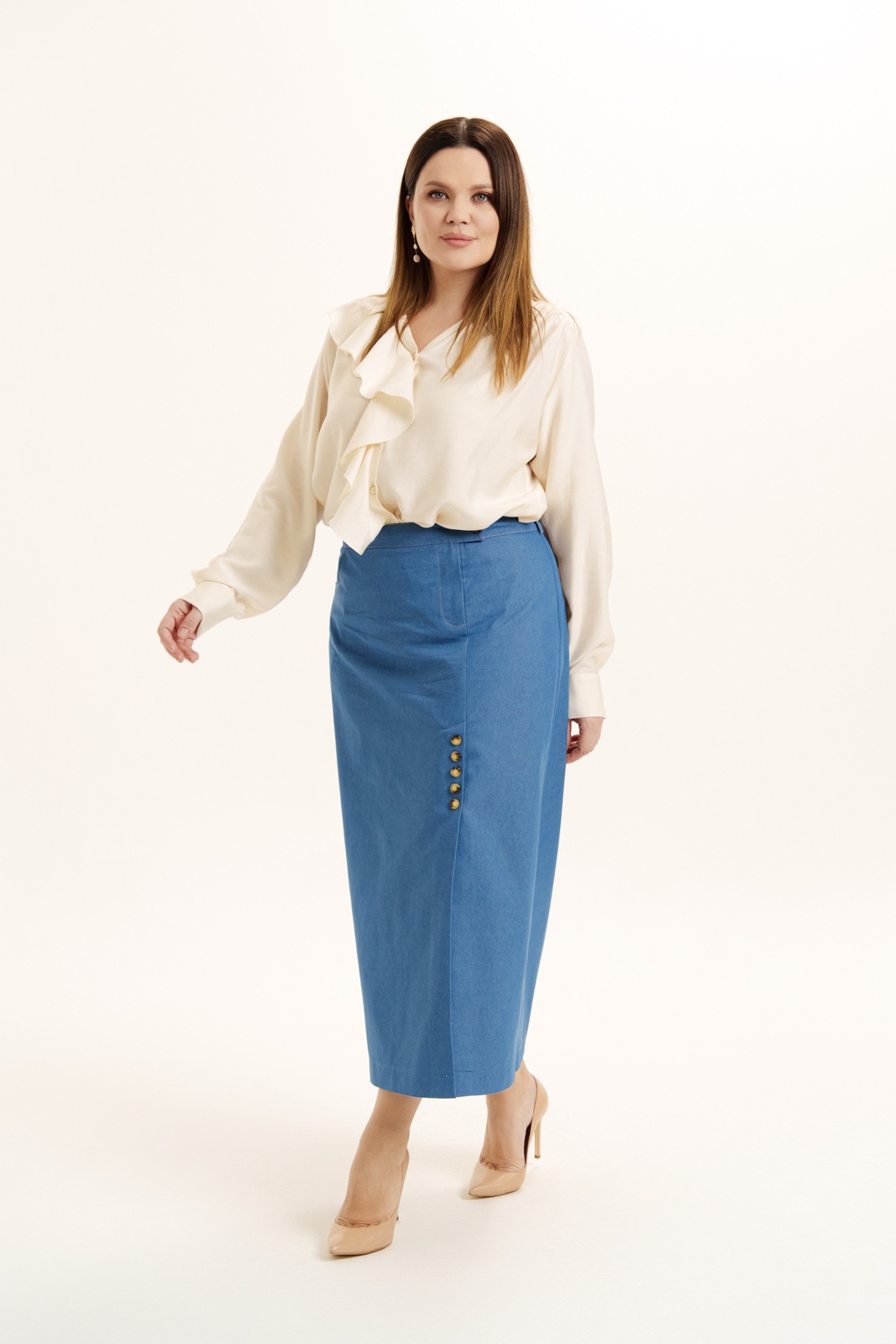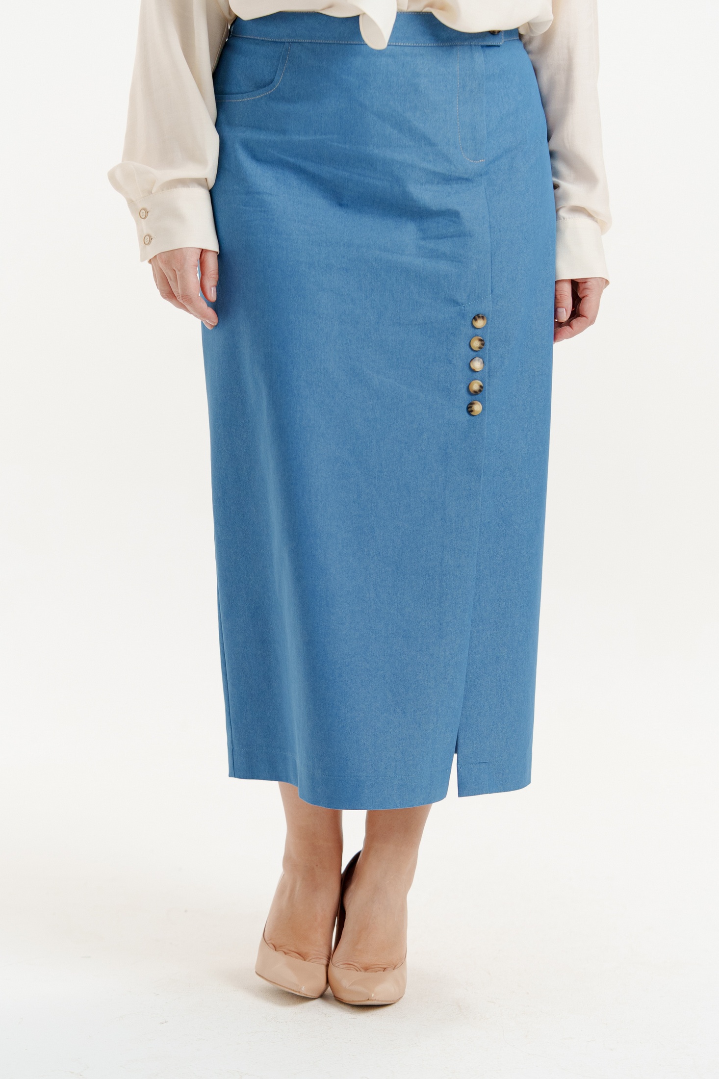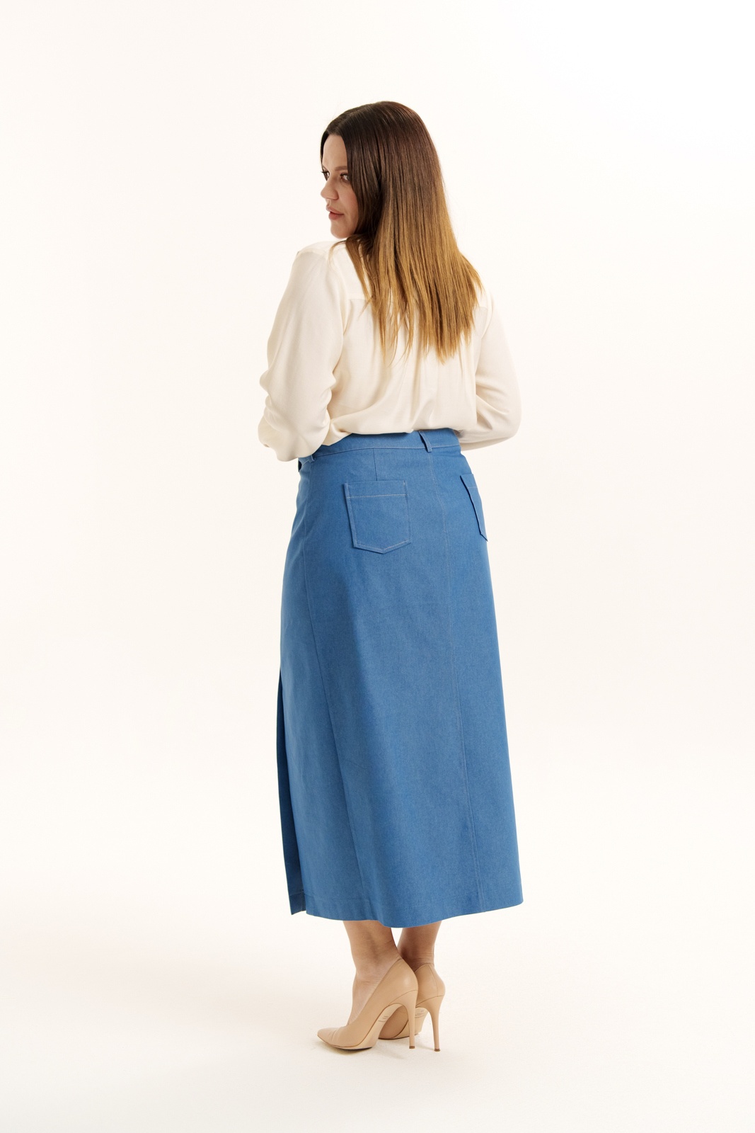 Юбка женская из джинсовой ткани без подкладки, длинны миди. На юбке обработаны карманы-хулиганы по переду и накладные карманы по спинке. На переднем полотнище юбки ассиметричная шлица декорирована кнопками. Пояс обработан закрытым срезом с застежкой на молнию и кнопку.