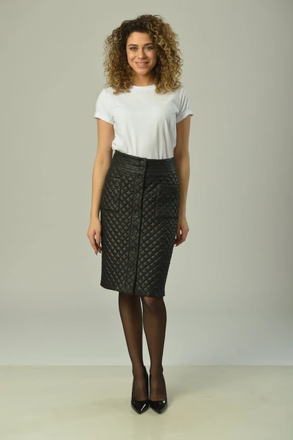 Юбка женская , зауженная к низу, с центральной застёжкой на кнопки по переду. Пояс переда и спинки отрезной. По переду -накладные карманы. По спинке талиевые вытачки. В качестве отделки используется фурнитура. Юбка на подкладке. Длина изделия 63 см.