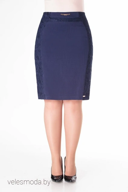 Юбка женская прямого кроя, на обтачном поясе. Спереди и по бокам вставки из кружева, наложенные на основную ткань. Задняя часть выполнена из двух деталей. Двухзамковая застёжка-молния в среднем шве сверху донизу. Юбка на подкладке. Длина юбки по среднему шву 48 – 60,5 см, в 50 – 60,5 см, в 52 – 61см, в 54 – 61 см, в 56 – 61 см, в 58 - 61 см.