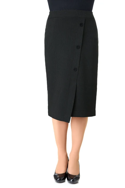 Юбка женская на обтачном поясе, из плотной ткани, на подкладке. Переднее полотнище выполнено из двух слегка асимметричных частей. Имитация запаха на 3 пуговицы, с небольшим разрезом. Заднее полотнище со средним швом и потайной молнией, 2 вытачки.