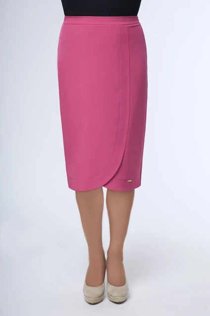 Юбка женская на притачном поясе (пояс частично на резинке), с подкладкой. Выполнена из костюмно-плательной ткани средней плотности. На переднем полотнище имитация запаха. На заднем полотнище средний шов, потайная тесьма-молния в нем, петля и пуговица, 2 вытачки, шлица.