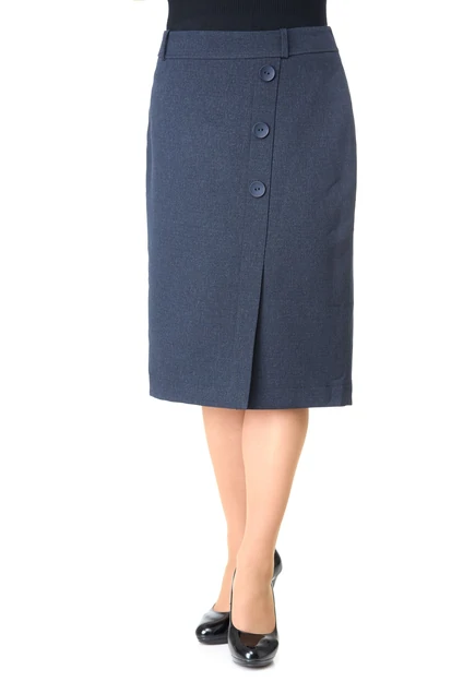 Юбка женская из плотной костюмной ткани в мелкую клетку. Юбка на притачном поясе со шлевками, на подкладке. Переднее полотнище выполнено в виде имитации запаха на 3 пуговицы, с разрезом. На заднем полотнище 2 вытачки, потайная тесьма-молния в среднем шве, шлица.