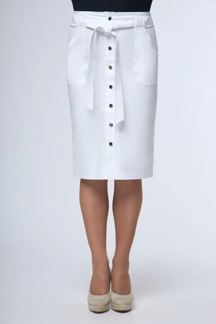 Юбка женская прямого силуэта, на обтачном поясе. Выполнена из джинсовой ткани средней плотности, без подкладки. По переду застежка на петли и пуговицы, накладные карманы. На заднем полотнище 2 вытачки. В комплекте пояс из основной ткани.