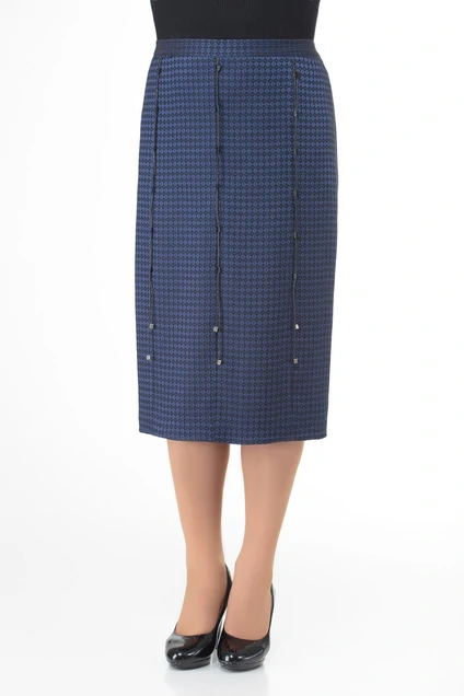 Юбка женская прямого силуэта, на притачном поясе (пояс частично на резинке). Выполнена из плательной ткани средней плотности, тянется, на подкладке. По переду рельефы, декоративные элементы. Заднее полотнище со средним швом, потайной тесьмой-молнией в нем и пуговицей, 2 вытачки, шлица.