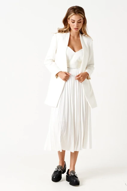 Юбка женская, из текстильной плиссерованной ткани, длиной ниже линии колен, без подкладке.Верхний срез юбки обработан поясом с застежкой на молнию. Юбка на подкладке. Длина 75 см.