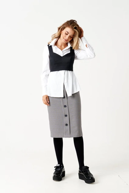 юбка женская, прилегающего силуэта, длиной ниже линии колен, из текстильной ткани. Перед с декоративным элементом в виде планки на пуговицах. Застежка на потайную молнию в среднем шве заднего полотнища юбки. Верхний срез обработан поясом. Юбка на подкладке. Длина 70 см.