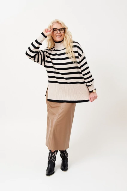 Юбка женская, А-силуэта, длиной миди из эко кожи. Перед со средним швом и подрезом по линии бедер. Спинка со средним швом и подрезом по линии бёдер. В левом боковом шве потайная застежка молния. Средний шов переда и спинки, а так же подрез переда и спинки оформлены расстрочным отделочным швом. Юбка на подкладке. Длина 81,5 см.