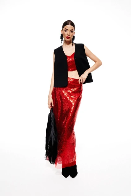 Юбка женская, приталеного силуэта, длиной до линии щиколотки из трикотажного полотна в пайетки. Перед с талиевыми вытачками. Заднее полотнище с талиевыми вытачками и со средним швом, застежкой на потайную молнию в нем и с разрезом. Юбка на подкладке. Длина 104 см.