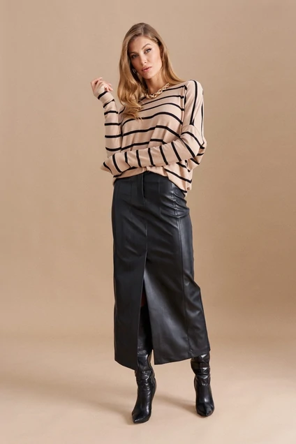 Юбка полуприлегающего силуэта из эко кожи. По переду рельефные швы, шлица. Спинка с рельефными швами, средним швом. Средний шов спинки заканчивается шлицей. Длина изделия миди.