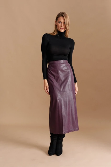 Юбка женская, на подкладке, приталённого силуэта, длиной миди из экокожи. Перед со средним швом, функциональной шлицей и поперечным подрезом, талиевыми вытачками. Заднее полотнище со средним швом и застёжкой на потайную молнию в нём, переходящую в пояс, талиевыми вытачками и пореречным подрезом. Пояс юбки частично на резинке. Средние и поперечные швы, и вытачки отстрочены декоративными отделочными строчками. Изнаночная сторона: 100% вискоза