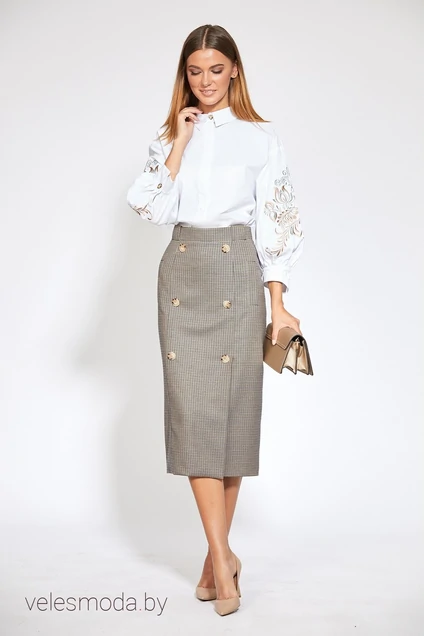 Юбка выполнена из костюмной ткани с рисунком "гусиная лапка", на подкладке, заужена к низу. Юбка на широком поясе с широкими шлёвками, застёжка сзади на потайную молнию в среднем шве. По переду вертикальные, декоративные карманы с листочкой, в рельефе спереди шлица с имитацией застёжки "в запах".