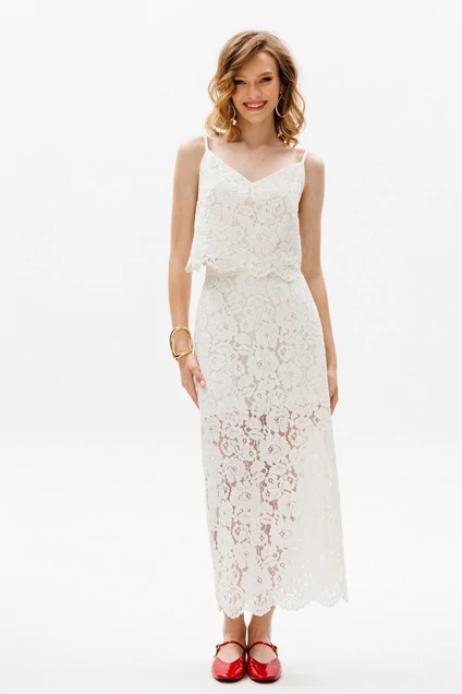 Юбка выполнена из гипюра. Юбка прямого силуэта длиной миди, на притачном поясе. На заднем полотнище в среднем шве застежка на потайную молнию. Пояс застегивается на петлю и пуговицу. По низу юбки фестоны. Юбка на короткой отлетной по низу подкладке.