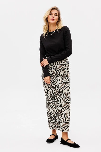 Юбка выполнена из трикотажного полотна. Юбка прямого силуэта, длиной миди. Юбка на притачном поясе с эластичной тесьмой. Переднее полотнище цельное. На заднем полотнище средний шов и разрез.