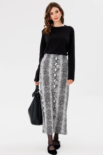 Юбка выполнена из трикотажного полотна с анималистичным принтом. Юбка прямого силуэта, длиной миди. Юбка на притачном поясе с эластичной тесьмой. Переднее полотнище цельное. На заднем полотнище средний шов и разрез.