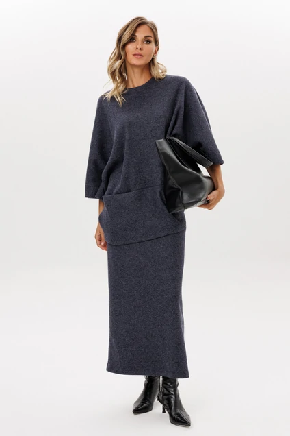 Юбка выполнена из трикотажного полотна. Юбка прямого силуэта, длиной миди, на цельнокроенном поясе с эластичной тесьмой. Сзади разрез в среднем шве.