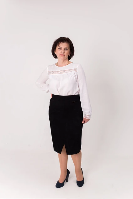 Юбка женская М-29, на кокетке, зауженная к низу ("карандаш"), на подкладке, на переднем полотнище юбки расположен угловой вырез. Длина 65 см.