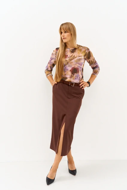 Элегантная юбка миди в глубоком шоколадном цвете — идеальное сочетание стиля и комфорта для вашего гардероба. Юбка выполнена из качественной костюмной ткани, что обеспечивает идеальное прилегание и удобство носки. Особый акцент в дизайне — высокий разрез по центру, добавляющий изделию изысканности и женственности. Длина юбки 83 см подчеркивает стройность фигуры и позволяет легко сочетать её как с обувью на каблуке, так и с более удобными моделями. Эта юбка станет универсальным решением для создания как деловых, так и более расслабленных образов.