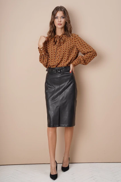 Модная кожаная юбка - это именно та часть женского гардероба, что позволяет с легкостью создавать многочисленные луки и на каждый день и для особого случая. Юбка-карандаш, зауженная к низу с эффектной шлицей по центру переда. Пояс отрезной со шлевками и сьемным декоративным поясом на пряжке. На передних половинках юбки сложный подрез с карманом. Задние полотнища юбки с талиевой вытачкой, средним швом и застежкой по центру. Длина юбки около 60 см.