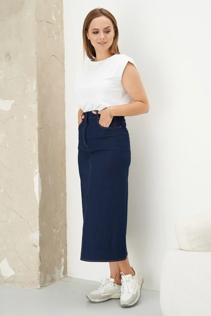 Джинсовая юбка-настоящий маст-хэв моды 2023 года. Она безусловно заслуживает место в базовом гардеробе. Сочетание длины макси с лаконичным кроем-беспроигрышное решение. Силуэт А-образный покрой классический джинсовый. Юбка на приточном поясе со шлёвками. Переднее полотнище юбки с застёжкой-гульфиком, боковыми фигурными карманами и ассиметричным подрезом. Заднее полотнище с отрезными кокетками, средним швом и накладными карманами.