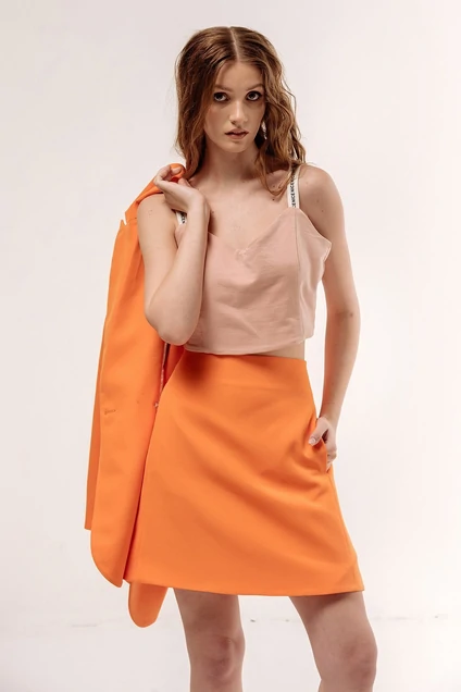Юбка А-силуэта. Характеристики: по переду два кармана в рельефах, выполнена из костюмной ткани в оранжевом цвете, юбка на подкладке, застежка-молния по заднему полотнищу юбки, верх юбки обработан поясом-обтачкой. Длина юбки 46,5 см.
