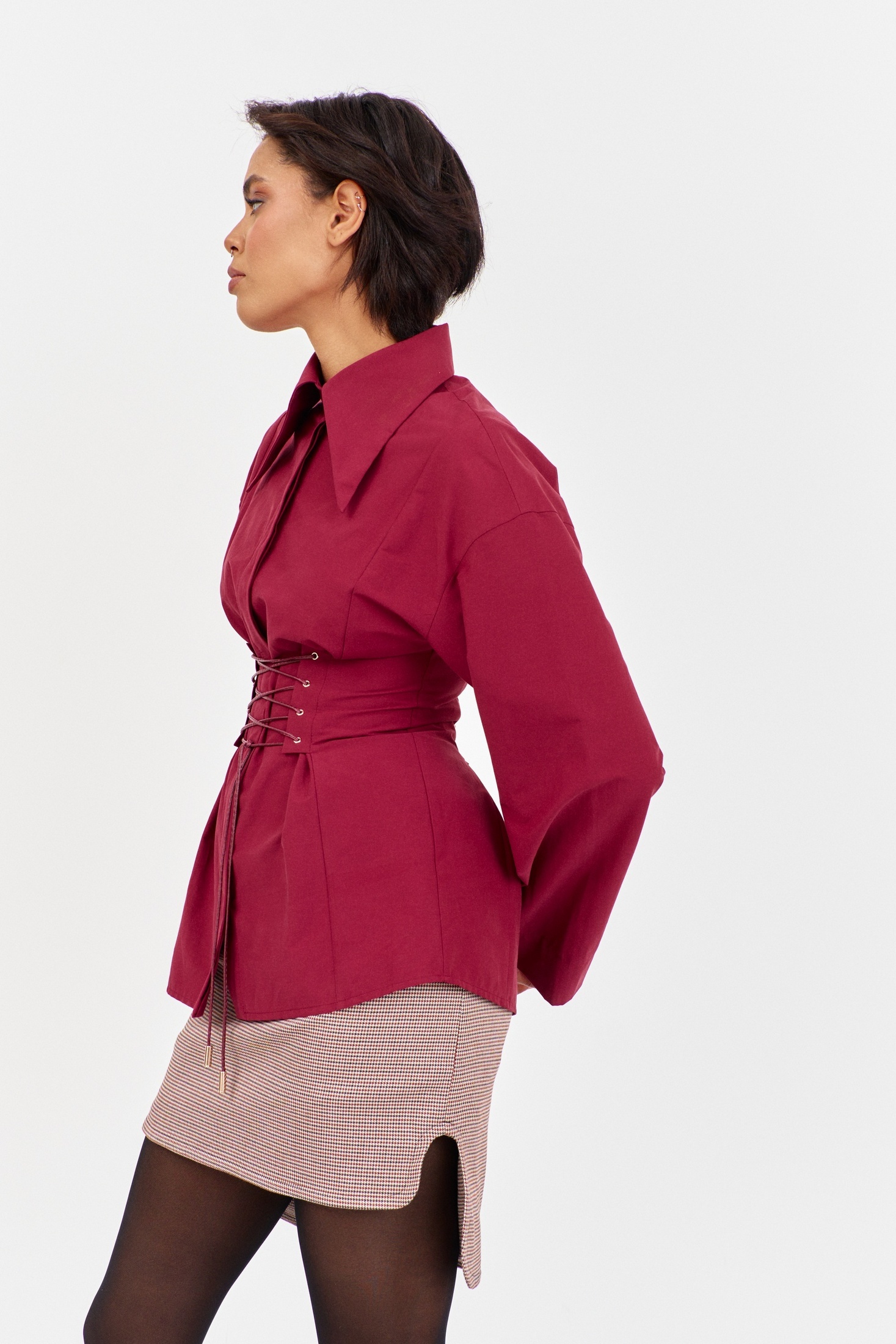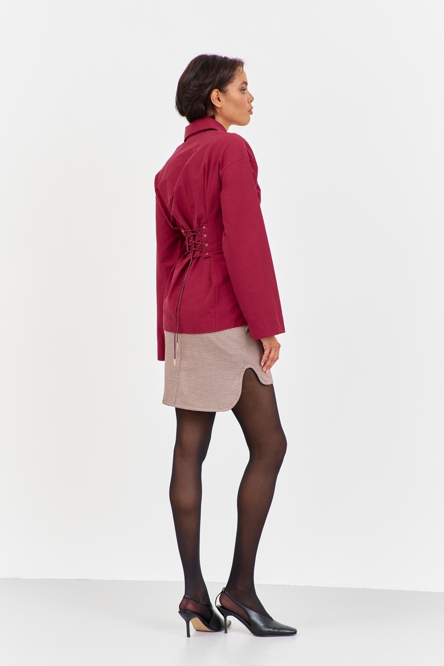 Юбка приталенного силуэта. Выполнена из плательной ткани в принте "гусиная лапка" пыльно-розовая. Низ юбки фигурный, по заднему полотнищу юбки застежка-молния. Длина юбки по переду 43 см, по спинке 50 см.