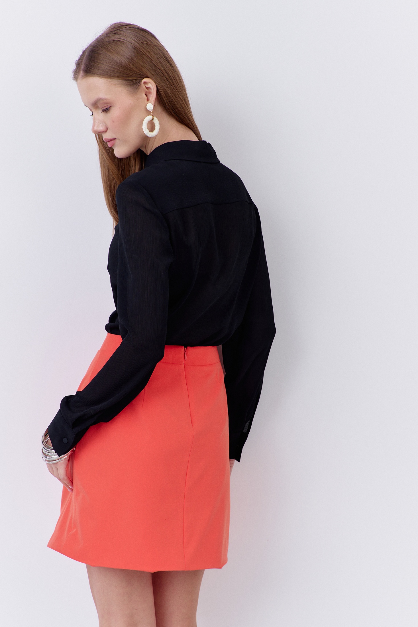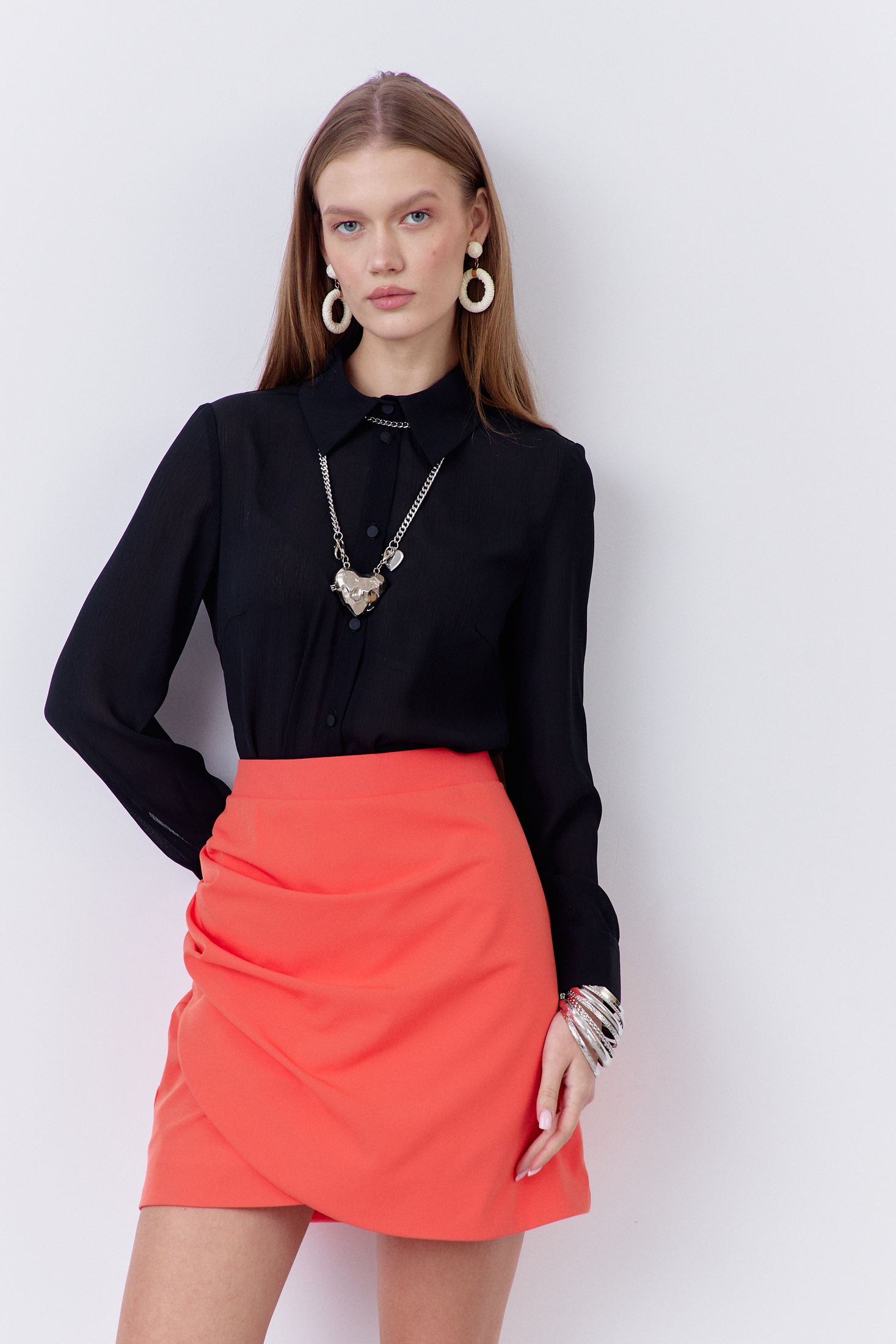 Юбка на запах. Характеристики: выполнена из плательной ткани в оранжевом цвете, по переду запах и складки, юбка на подкладке, застежка-молния по заднему полотнищу юбки, верх юбки обработан поясом-обтачкой.