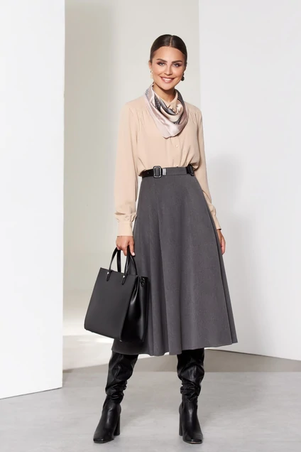 Юбка А-образного силуэта на притачном поясе. Переднее полотнище со складками. Заднее полотнище со средним швом. Застежка в среднем шве на потайную тесьму молнию и с пуговицей на поясе. Пояс украшен декоративными клевантами. Юбка на подкладке. Длина юбки - 74,5 см.