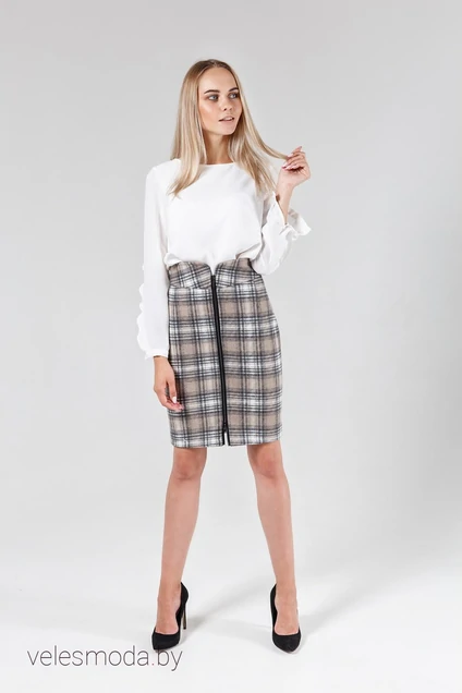 Юбка выполнена из пальтовой ткани на подкладке. Юбка заужена к низу с застежкой-молния в центре переда. Необычной формы пояс может отворачиваться на внешнюю сторону, при слегка расстегнутой молнией с верху.