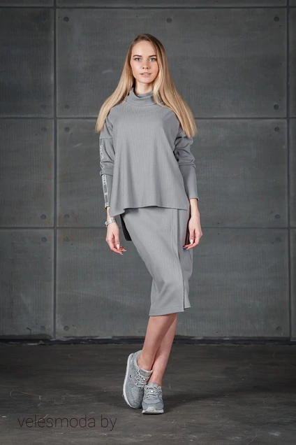 Юбка из трикотажа, зауженная к низу, на запах. Пояс юбки на резинке.