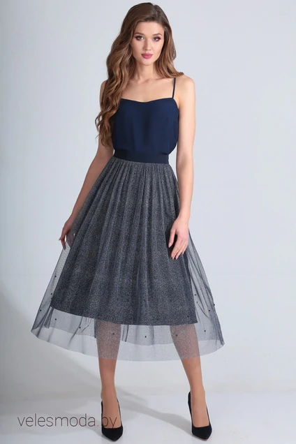 Цветовая гамма для верха, подкладки, фурнитуры, отделки: юбка двуслойная, верхний слой из сетки с люрексом, декорирована пришивными бусинами. Нижни слой из основной ткани, в тон сетки. Длина изделия: 82 см