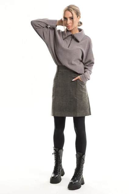 Юбка с отрезным поясом, застегивающимся на две петли и пуговицы, застежкой на потайную молнию в среднем шве задней половинки. Пояс со шлевками. Переднее полотнище с рельефами, на боковых деталях юбки расположены карманы. Заднее полотнище со средним швом, талиевыми вытачками.