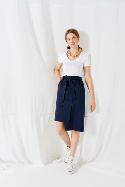Юбка женская прямого силуэта, асимметричные передние и задние полотнища создают фантазийные геометрические линии, по передним половинкам расположены функциональные настрочные карманы. Притачной пояс с резинкой по бокам и декоративным поясом из основной ткани. В заднем шве шлица, для более комфортной носки изделия. Стильный фасон подчеркнет уникальность вашего образа. Длина изделия – 57см/66см
