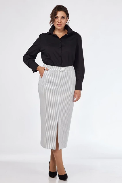 Юбка прямого силуэта зауженная к низу, длинной мидакси, на притачном поясе, в который по бокам вставлена эластичная тесьма. По переду и спинке юбки выполнены вертикальные швы. По переду расположены функциональные карманы и разрез по центру, высотой 29см. На заднем полотне юбки отрезная кокетка. Застёжка по переду на тесьму-молнию и петлю-пуговицу. Классическая юбка с декоративными отстрочками подойдет для любого гардероба и будет комфортной и уместной. Длина изделия – 87см. белый в темно-серую полоску