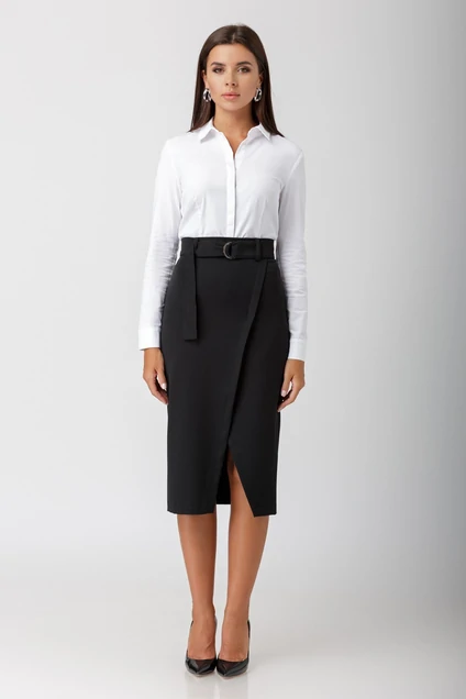 Юбка-карандаш с запахом. Нижняя полочка с фигурным срезом. Притачной пояс со шлевками. Застежка на потайную молнию в среднем шве спинки. Без подкладки.
