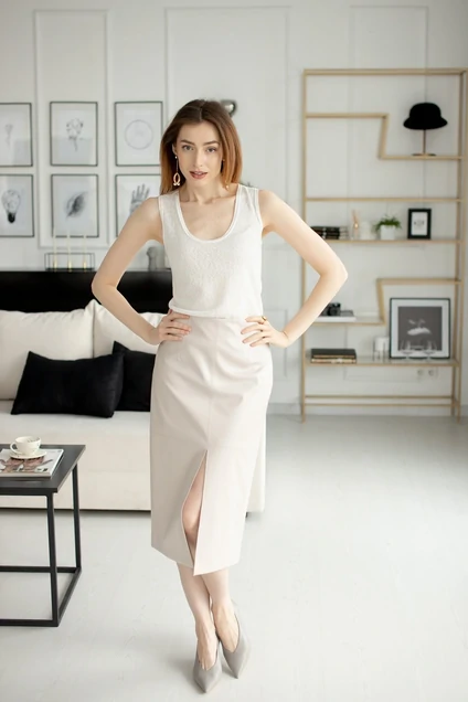 Современная практичная и удобная юбка из экокожи на подкладке с разрезом спереди станет изюминкой в создании стильного лука: повседневного, классического, праздничного, романтического. Удачно подчеркнет все достоинства фигуры, позволит вам быть неповторимой и милой в своем образе.