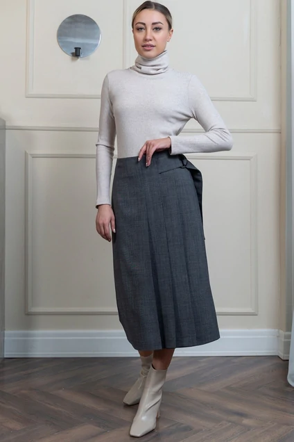 Представляем вашему вниманию стильную женскую юбку трапецию длиной миди, которая станет изюминкой вашего гардероба. Эта юбка обязательно привлечет внимание своей необычной деталью - спереди расположены три заутюженные складки, которые добавляют образу женственности и шарма. С другой стороны юбки находится декоративная пряжка, что придает изделию особый шарм и оригинальность. Юбка изготовлена из высококачественного материала с небольшим процентом шерсти, благодаря чему она не только выглядит элегантно и стильно, но и обеспечивает комфорт и уют в холодное время года. Наличие подкладки гарантирует дополнительное тепло и комфорт при носке. Для удобства надевания юбка оснащена застежкой-молнией, которая скрыта от посторонних глаз и не нарушает элегантный внешний вид изделия. Эта модель юбки станет отличным выбором для создания разнообразных образов - от классических и строгих до романтичных и женственных. Она прекрасно сочетается с различными видами блузок, свитеров и жакетов, позволяя вам экспериментировать и создавать новые стильные ансамбли. Не упустите возможность приобрести эту уникальную юбку трапецию с заутюженными складками и декоративной пряжкой.