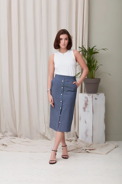 Юбка женская прямого силуэта из ткани джинс, с застежкой молнией в среднем шве зп на притачном поясе .По переду юбки планка с иммитацией застежки на 7 петель и пуговиц,с наклонными карманами.